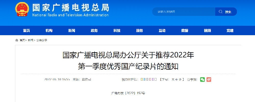 国家广播电视总局办公厅关于推荐2022年 第一季度优秀国产纪录片的通知 |